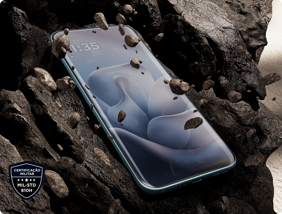Com base de referência em telefones do mesmo segmento (com preço de lançamento no site do fabricante entre R$ 2.999,00 e R$ 3.999,00) lançados até Outubro de 2025. MIL-STD-810H: conjunto de testes de laboratório projetado pelo departamento militar dos EUA para avaliar limitações do dispositivo em condições ambientais extremas. O desempenho no uso cotidiano pode variar. O motorola edge 70 foi testado em 16 categorias e 14 procedimentos MIL-STD-810H para provar sua resistência. A garantia padrão da Motorola não cobre abusos, como os que ocorrem nos testes MIL-STD 810H. Testado em laboratório sob condições controladas, o telefone é resistente a água, respingos e poeira com as classificações IP68 e IP69 (IEC 60529). O telefone suporta imersão em água doce até 1,5 metro de profundidade por 30 minutos e tem proteção contra jatos fortes de água quente por até 30 segundos. A exposição a condições fora desses parâmetros não está coberta pela garantia. A resistência diminui devido ao desgaste normal. O dispositivo não foi projetado para funcionar quando estiver submerso. Não o exponha a outros líquidos. Não tente carregar o telefone se ele estiver molhado. O projeto prevê proteção contra a entrada de sólidos de qualquer tamanho. Não é à prova d’água.