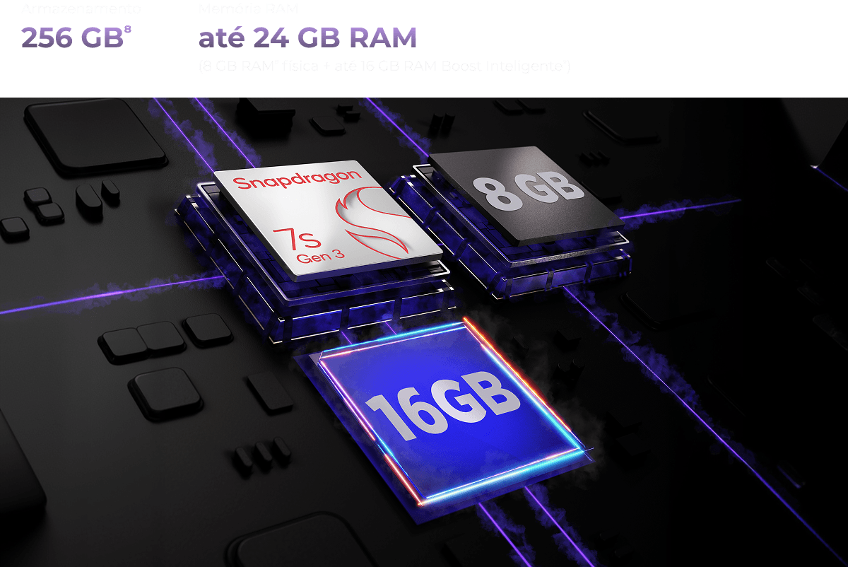 RAM Boost Inteligente (Otimização da RAM) é um recurso que cria memória RAM virtual especificamente para aumentar a capacidade do smartphone de manter vários aplicativos abertos simultaneamente. Requer o uso de parte do armazenamento interno, diminuindo o espaço disponível em um terço da memória RAM virtual pretendida. Função ativada por padrão, que pode ser desativada pelo usuário. A memória RAM e espaço de armazenamento interno disponíveis são menores devido ao sistema operacional, software e outras funções, e podem mudar de acordo com atualizações de software. Modelo de 8 GB: modelo com RAM física de 8 GB + RAM Boost Inteligente de até 16 GB (otimização automática com IA ativada por padrão). A memória RAM e espaço de armazenamento interno disponíveis são menores devido ao sistema operacional, software e outras funções, e podem mudar de acordo com atualizações de software. Os recursos variam conforme o mercado.