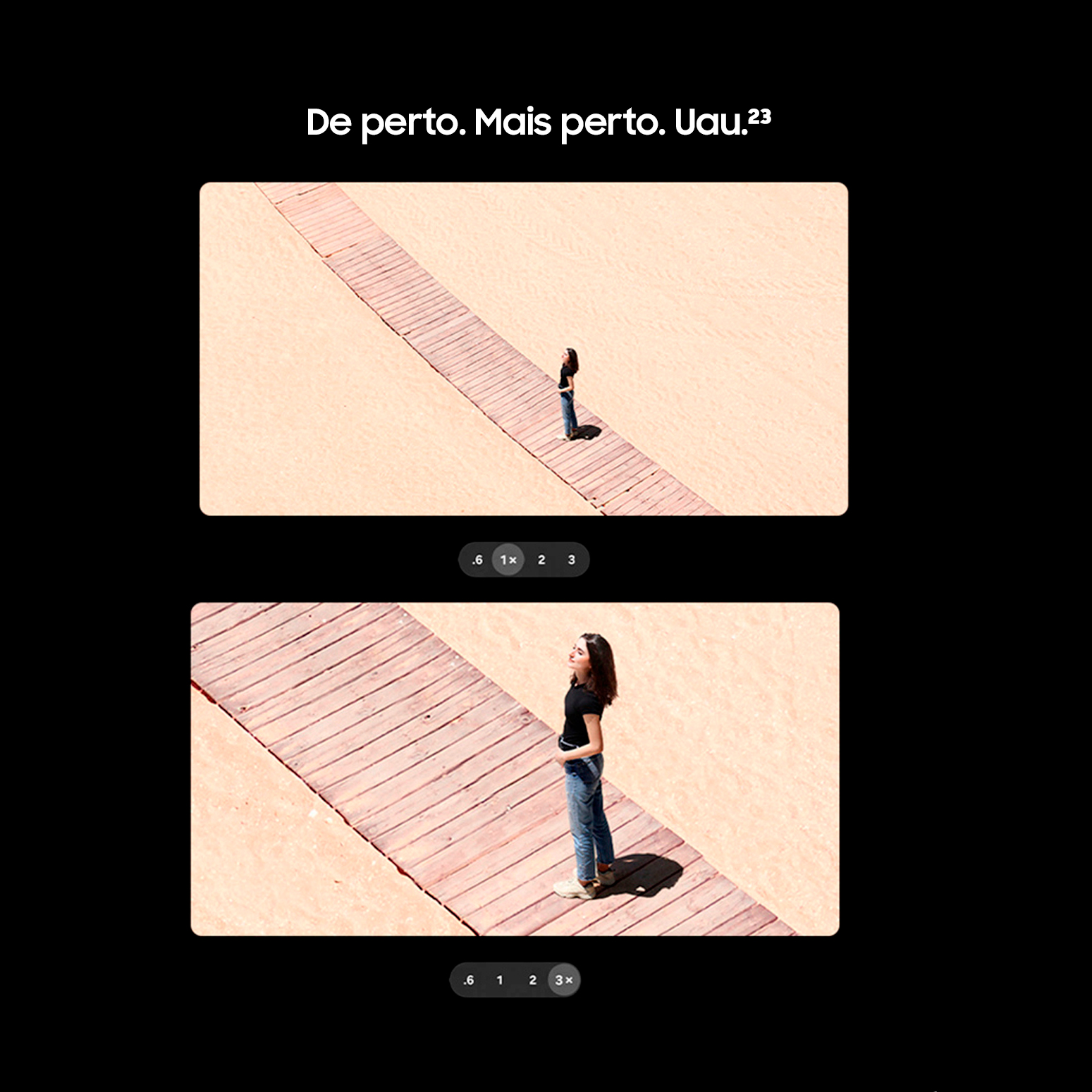 As câmeras frontais do Galaxy S26 e do S26+ agora contam com um processador de sinal de imagem por AI (ISP) para selfies mais naturais, com sombras e realces exatamente onde devem estar, fiéis ao seu tom de pele e a detalhes como cabelo e sobrancelhas, do jeito que seus olhos veem.¹